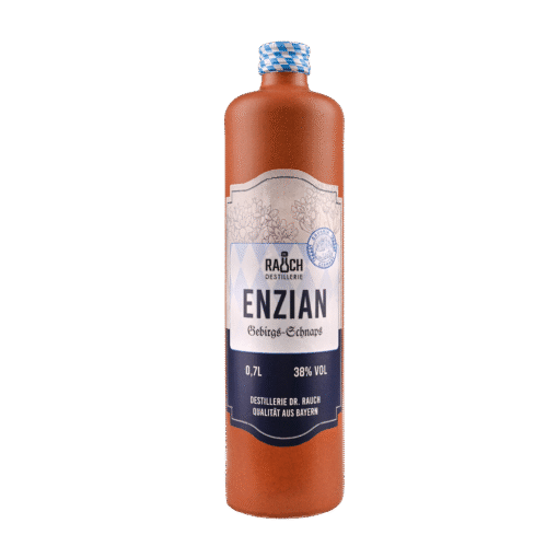 Enzian Gebirgs-Schnaps – eine besonders würzige urbayerische Spezialität. Das kristallklare Destillat mit seinem typischen Aroma – kräftig und doch mild – genießt man als Aperitif vor dem Essen oder als Digestif danach.
